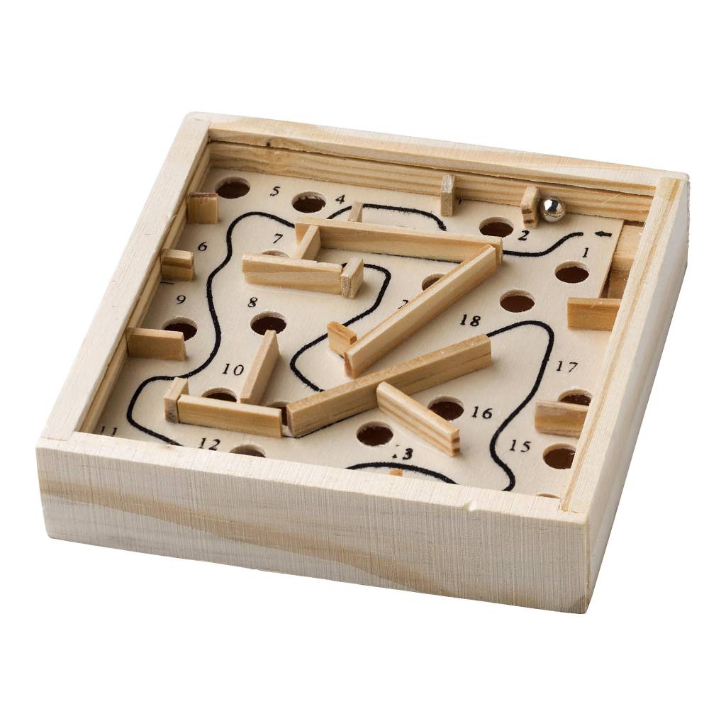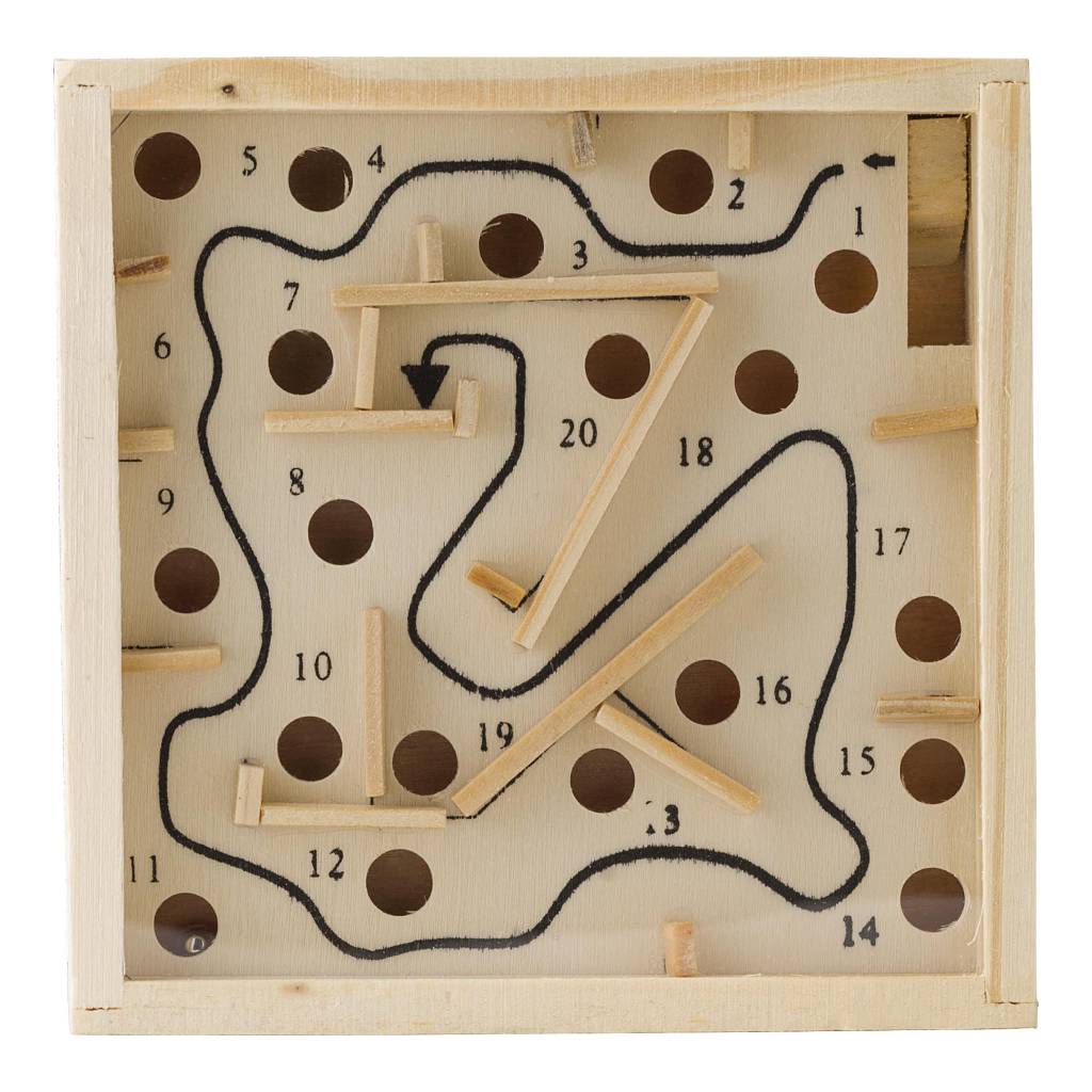 Drvena igra strpljenja s plastičnim okvirom. Slijedite putanju brojeva kako biste završili igru bez dopuštanja da metalna kugla padne u cjeline. Pojedinačno pakirano u smeđu kartonsku kutiju.