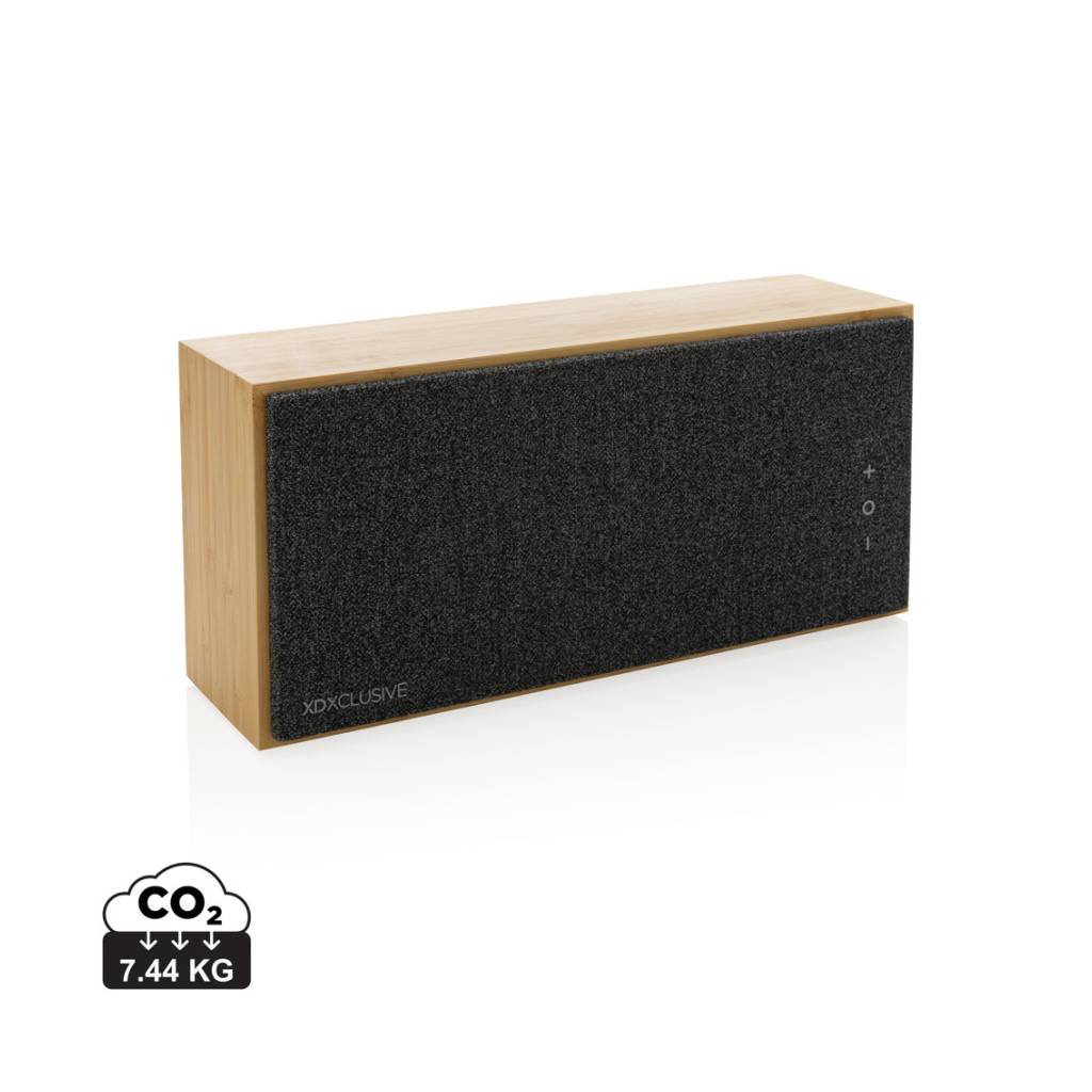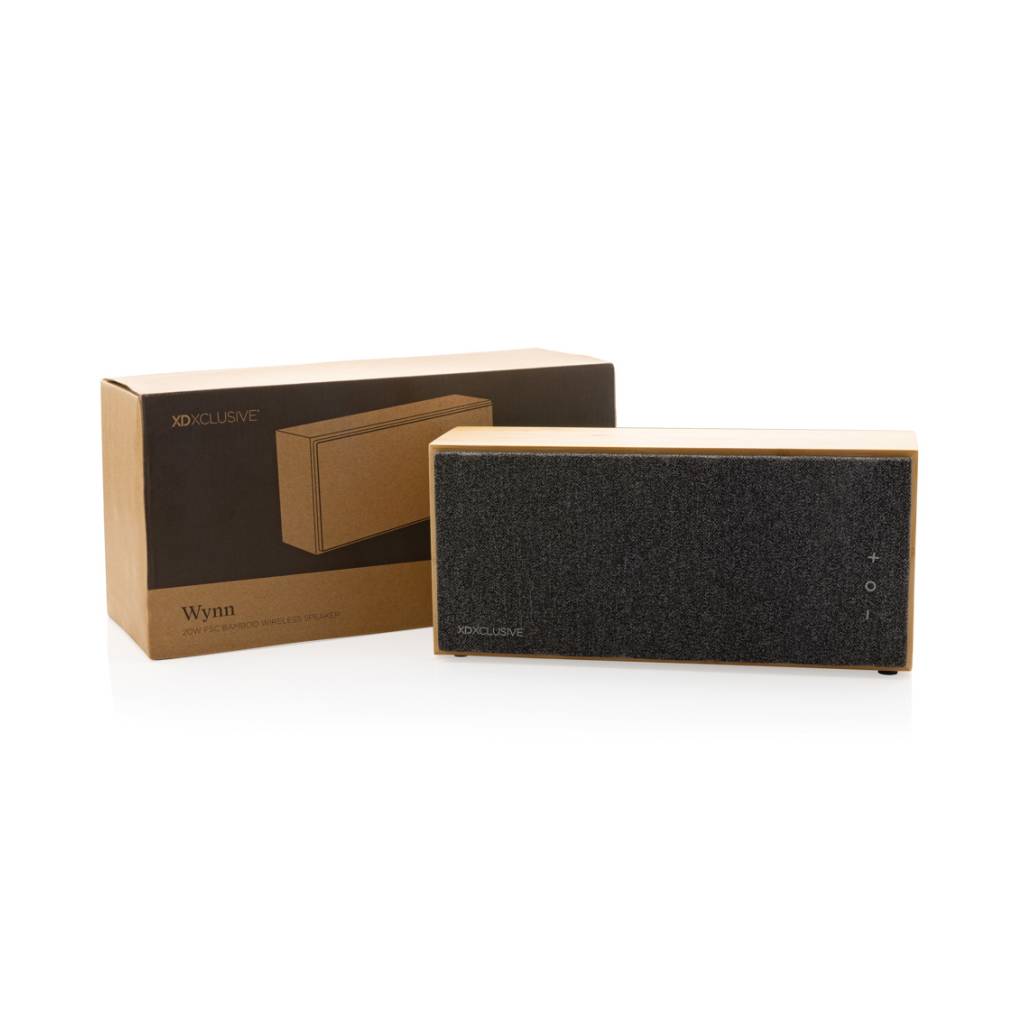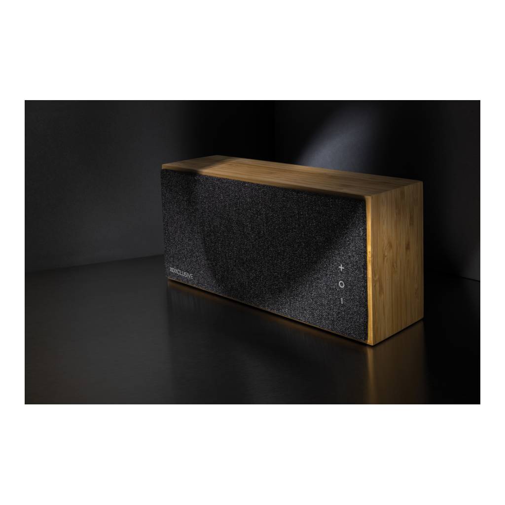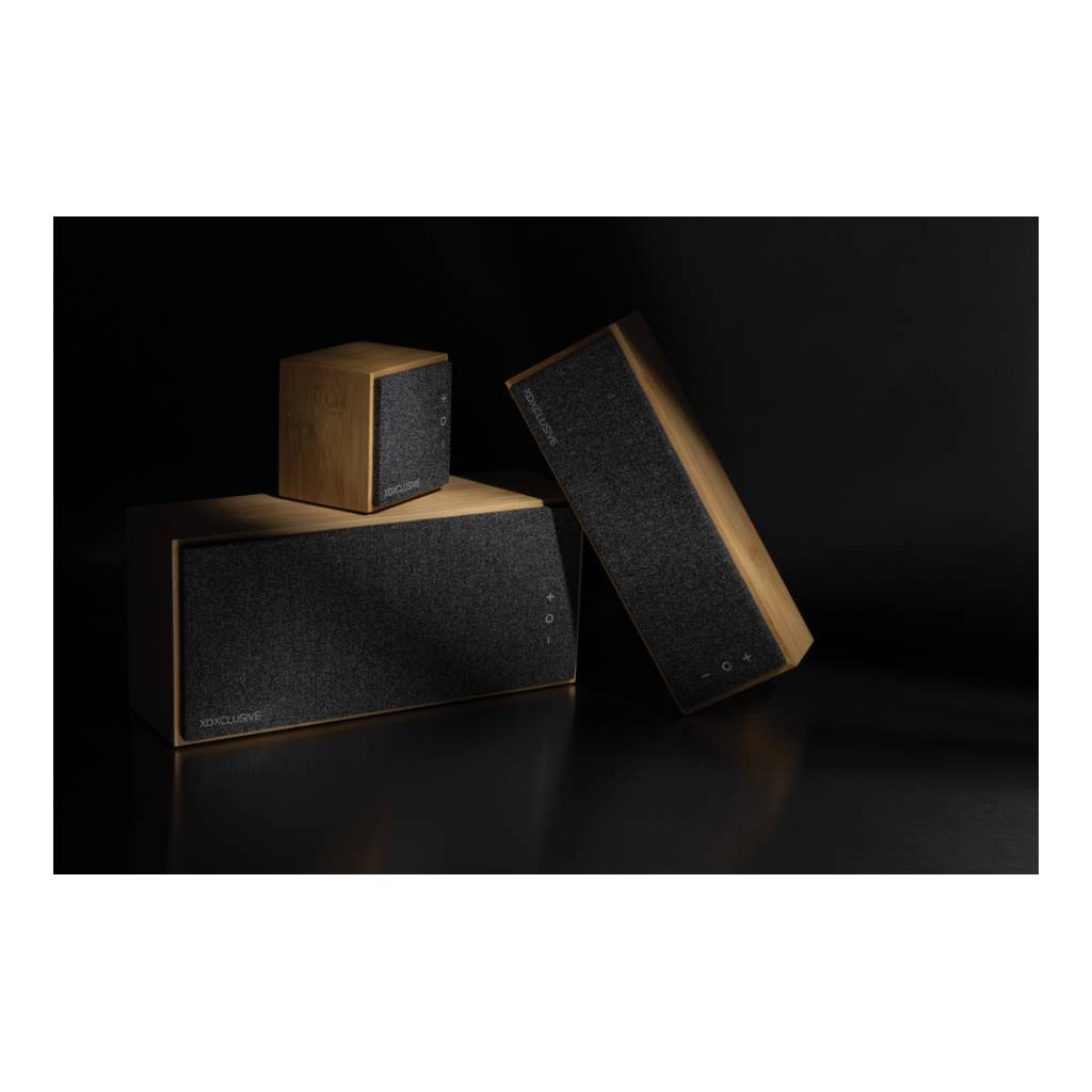 Luksuzni i snažni zvučnik od 20 W s čistim zvukom i snažnim basom. Vanjsko kućište izrađeno je od bambusa s FSC 100% certifikatom. Plastične komponente izrađene su od recikliranog ABS-a s certifikatom RCS (Recycled Claim Standard). Ukupni reciklirani sadržaj: 17 % na temelju ukupne težine predmeta. RCS certifikat osigurava potpuno certificirani opskrbni lanac recikliranih materijala. Zvučnik dolazi s BT 5.1 za jednostavan i glatki rad do 10 metara i nisku potrošnju energije. Baterija od 1200 mah omogućuje reprodukciju do 6 sati i može se u potpunosti napuniti za 3 sata. S funkcijom javljanja i mikrofonom za odgovaranje na (video) pozive. Pakirano u FSC mix kraft kutiju. Uključujući RCS certificirani reciklirani TPE kabel za punjenje.