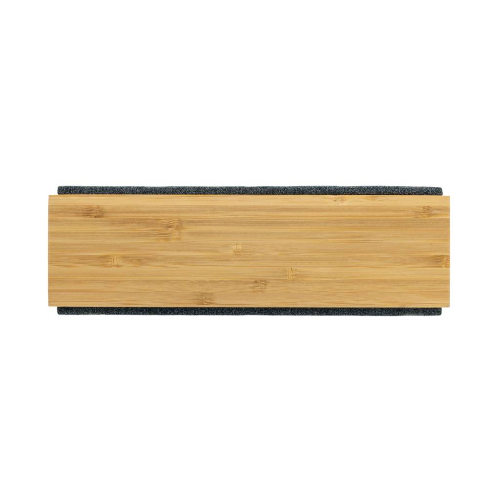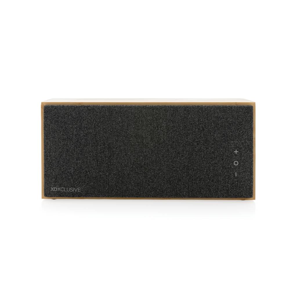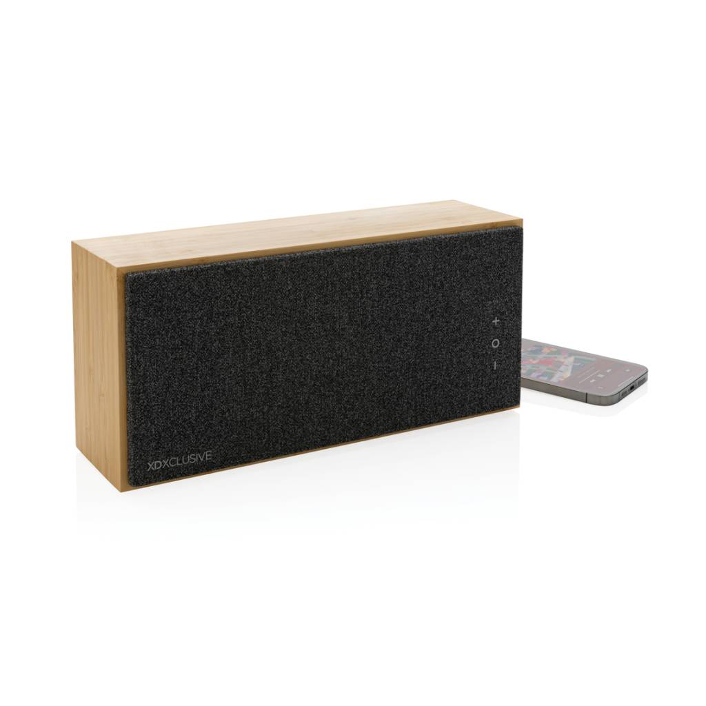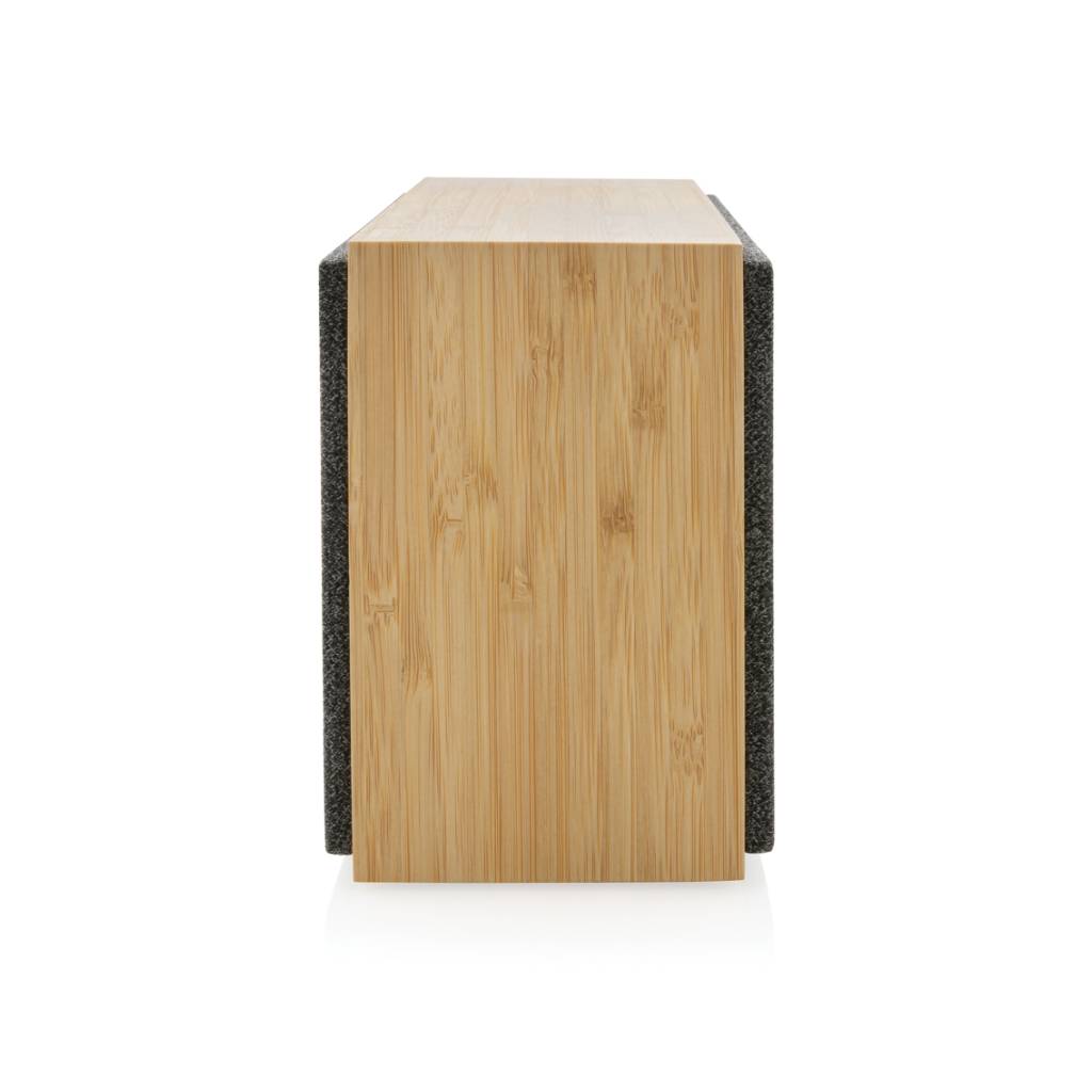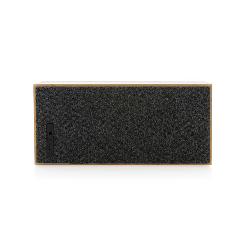 Luksuzni i snažni zvučnik od 20 W s čistim zvukom i snažnim basom. Vanjsko kućište izrađeno je od bambusa s FSC 100% certifikatom. Plastične komponente izrađene su od recikliranog ABS-a s certifikatom RCS (Recycled Claim Standard). Ukupni reciklirani sadržaj: 17 % na temelju ukupne težine predmeta. RCS certifikat osigurava potpuno certificirani opskrbni lanac recikliranih materijala. Zvučnik dolazi s BT 5.1 za jednostavan i glatki rad do 10 metara i nisku potrošnju energije. Baterija od 1200 mah omogućuje reprodukciju do 6 sati i može se u potpunosti napuniti za 3 sata. S funkcijom javljanja i mikrofonom za odgovaranje na (video) pozive. Pakirano u FSC mix kraft kutiju. Uključujući RCS certificirani reciklirani TPE kabel za punjenje.